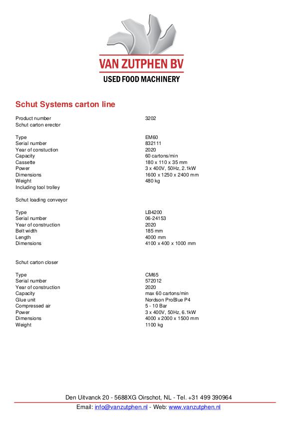 | Description | Schut carton erector Type EM60 Serial number 832111 Year of constuction 2020 Capacity 60 cartons/min Cassette 180 x 110 x 35 mm Power 3 x 400V, 50Hz, 2.1kW Dimensions 1600 x 1250 x 2400 mm Weight 480 kg Including tool trolley Schut loading conveyor Type LB4200 Serial number 06-24153 Year of construction 2020 Belt width 185 mm Length 4000 mm Dimensions 4100 x 400 x 1000 mm Schut carton closer Type CM65 Serial number 572012 Year of construction 2020 Capacity max 60 cartons/min Glue unit Nordson ProBlue P4 Compressed air 5 - 10 Bar Power 3 x 400V, 50Hz, 6.1kW Dimensions 4000 x 2000 x 1500 mm Weight 1100 kg |