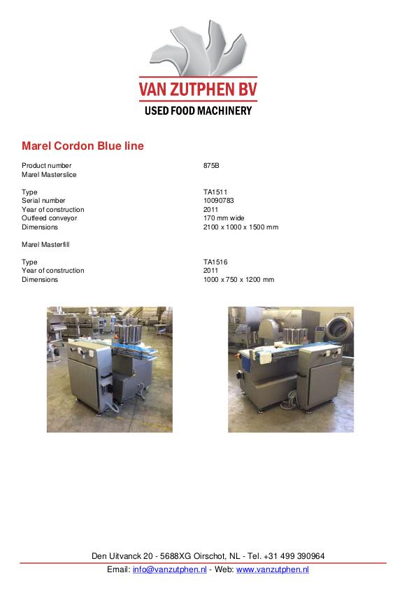 | Description | Marel Masterslice Type TA1511 Serial number 10090783 Year of construction 2011 Outfeed conveyor 170 mm wide Dimensions 2100 x 1000 x 1500 mm Marel Masterfill Type TA1516 Year of construction 2011 Dimensions 1000 x 750 x 1200 mm |