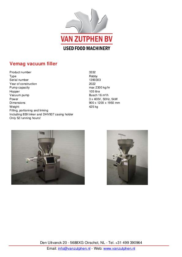 | Description | Filling, portioning and linking Including 859 linker and DHV937 casing holder Only 52 running hours! |